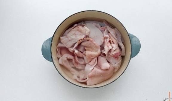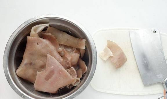 1.将500克猪皮洗干净后焯水,待冷却之后去除杂毛,刮干净猪皮背面的油脂。