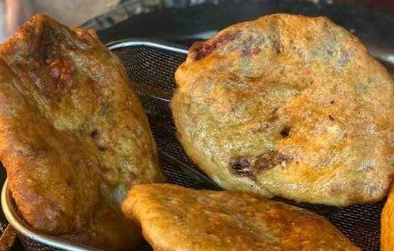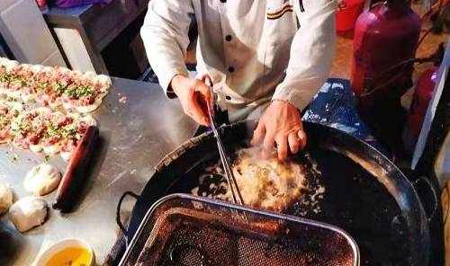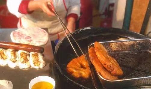 牛肉饼的做法其实不难,前一天晚上将面粉发酵,这样会使面更加的宣软,选择当天新鲜的猪肉,剁成肉馅备用,第二天把发酵好的面分成一个个小剂子,擀成牛肉状,涂抹上自己家调配的的酱料,撒上葱花,放上一两的肉馅,想吃肉多一点的还可以多加,最后包住擀成大圆饼,放到油锅里炸,两分钟基本就能出锅了。饼里多加肉需要支付8元,还可以根据口味让大叔加麻椒。他家做成王者,被很多食客认可,都认为最大的特点就是原材料新鲜,并且现场制作。肉饼的饼皮表面有嚼劲,里面的面宣软,肉馅即使只卖5元的也很充实,食量不大的朋友,这样一个刚好。唯一的缺点就是有点油,因为用了大量的油炸,吃多了会有些腻。04评价