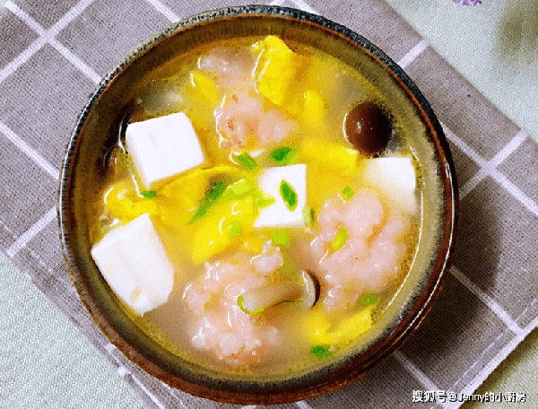 接着放入虾滑、豆腐块,小火煮两分钟。最后放入蛋皮,加入盐、白胡椒粉调味。出锅后撒些葱花即可食用。