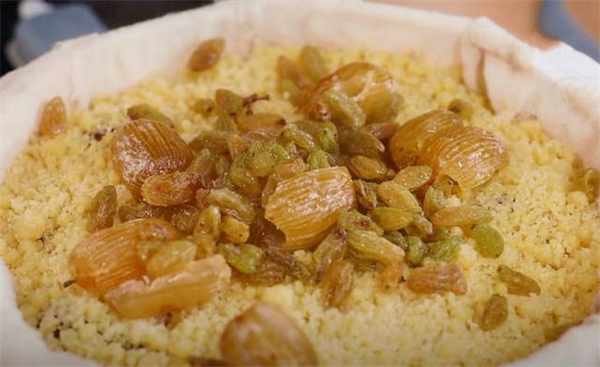 4.继续撒干的黄米面,又蒸了大概有8分钟的时间,这时候我们再放上一层蜜枣和葡萄干。