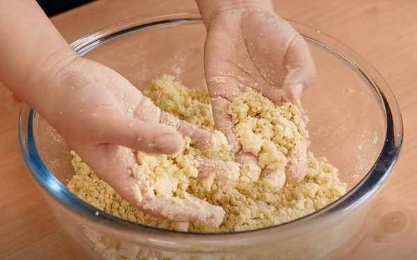 2.处理完红枣之后,我们倒上400g的黄米面,少量多次的用热水和面,一直搅拌到看不到干粉的时候,我们就开始搓一搓,最后拌好的状态就是这种一捏成型,一搓就会很容易松散开的程度就可以了。