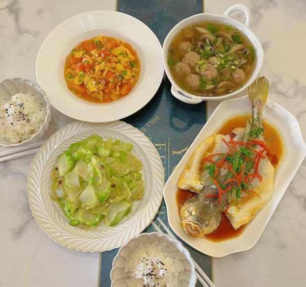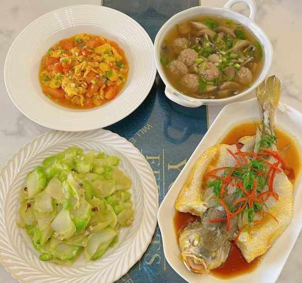 午餐有清蒸黄花鱼、番茄炒鸡蛋、炒儿菜、口蘑肉丸汤,简简单单的家常菜,健康又美味。