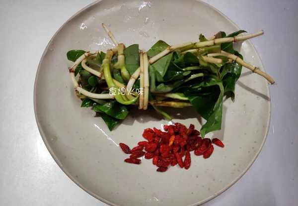 2.鱼腥草摘回后放在盆中,将其根部上面的须须去掉,还有老叶也要挑出来。随后将它们放在盆中,里面加入适量的水,将它清洗2-3遍。清洗干净后的鱼腥草放在盆中,整理好,打个结,放一旁备用。枸杞放在盆中,加入面粉,清洗干净,洗净放在一旁备用;