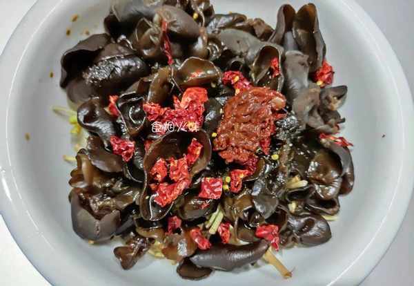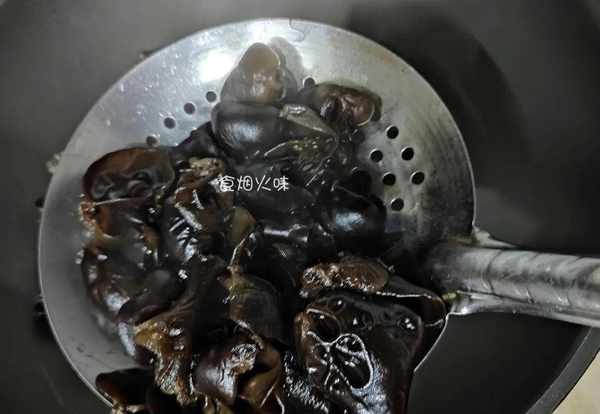 6.木耳焯水后用漏勺捞出,沥干水分后倒入折耳根的盆中;