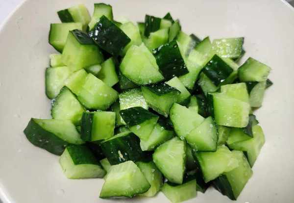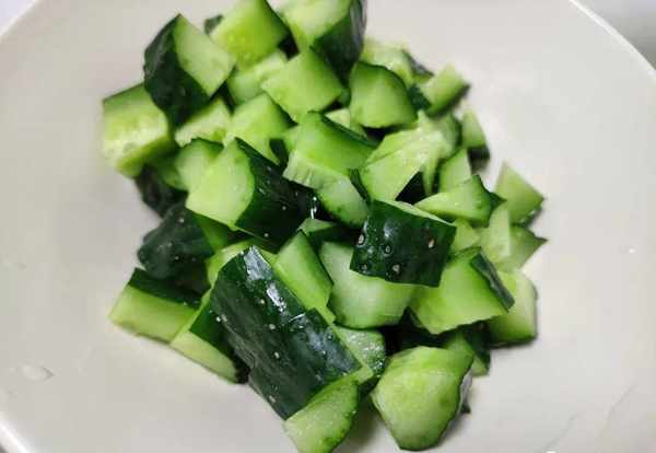 3.黄瓜中含有丰富的维生素,而且它的口感清脆爽口。准备好的黄瓜用清水洗净,手心抓一把食盐,将黄瓜搓洗面。搓洗干净后的黄瓜放在案板上,用刀去掉头尾,再对半切改刀切成细条状,随后给它切成细丁状,切好后的黄瓜放在盆中;