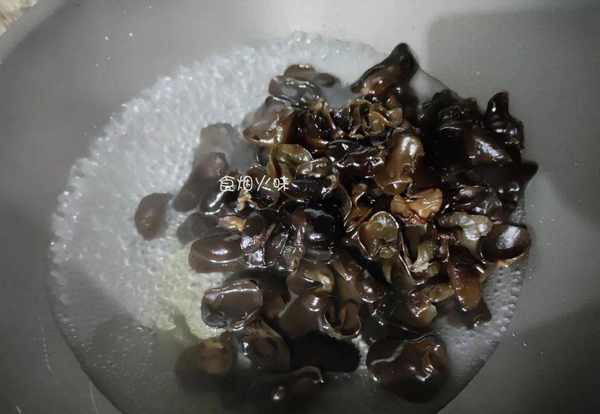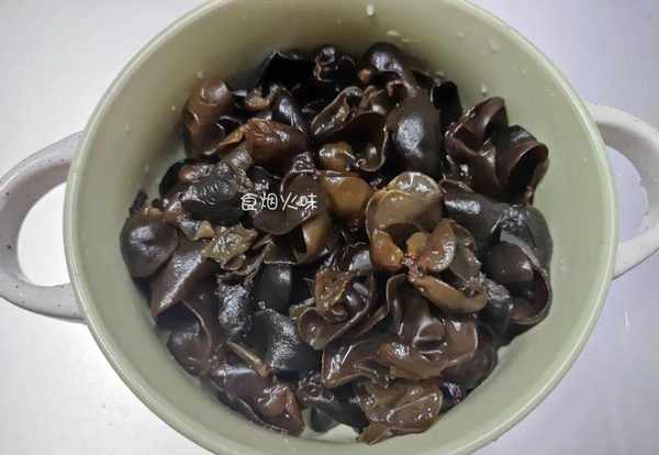 3.木耳要提前放入锅中泡开,而且要加温水。温水泡发更快,而且营养不易流失。经过浸泡后的木耳用手搓洗干净,洗净后的木耳放盆中备用;