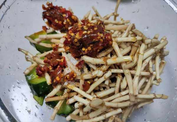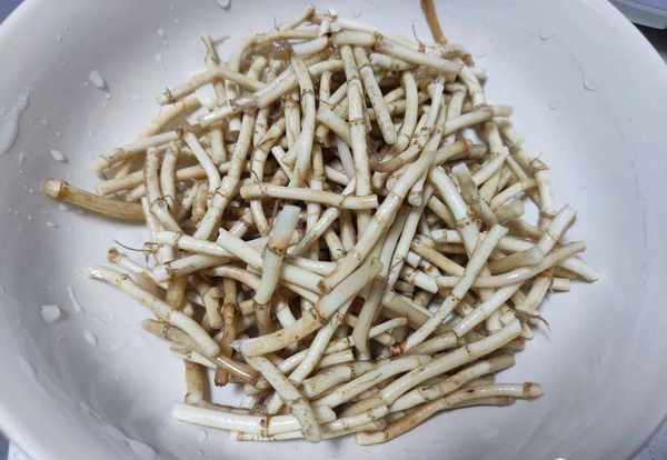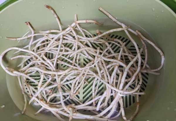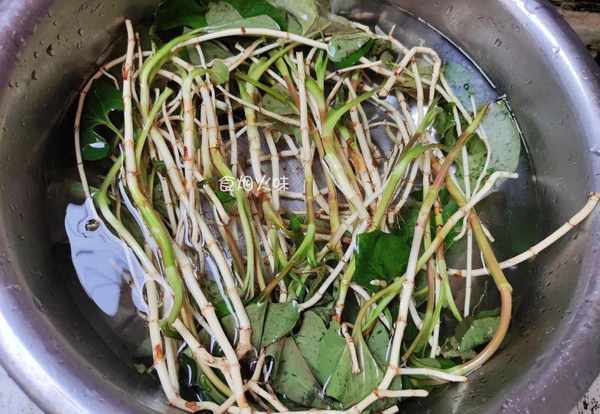 鱼腥草处理好根须后放入盆中,加入适量清水浸泡会儿。经过浸泡后的鱼腥草吸收水分,脆嫩多汁,口感更佳。泡好的鱼腥草用手搓洗,将其根茎的面洗干净;
