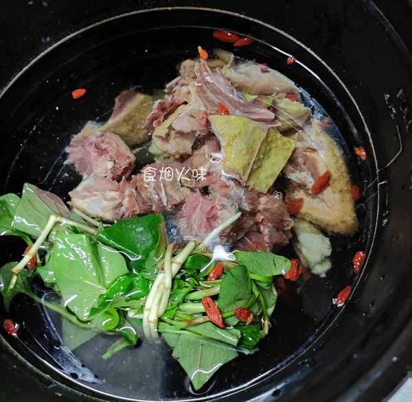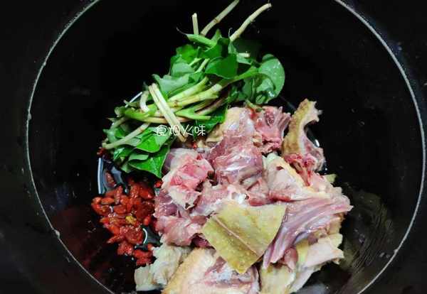 3.洗净的鸭肉,鱼腥草,枸杞放入锅中;