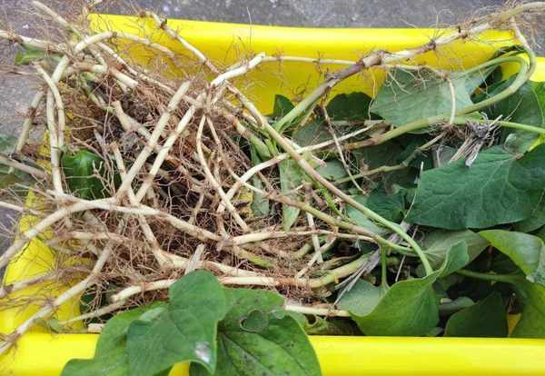 2.清洗好后的折耳根放在一旁,用手将折耳根折成自己喜欢的大小,处理好后放在盆中备用;