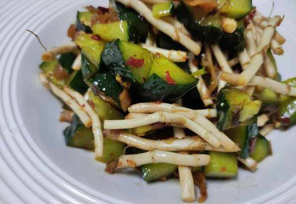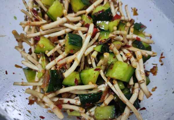 4.黄瓜放入盆里面加入一勺食盐,用筷子将它们搅拌,放着腌制30分钟。食盐水腌制可以更好地将黄瓜里面的水分“”出来,这样吃起来口感更加爽脆;