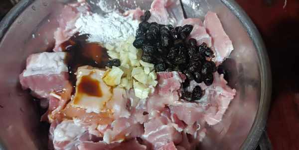 3、豆豉放大概20粒左右,先要用清水稍微冲洗几下,再放入排骨中,搅拌均匀,再加入一勺花生油锁住水分。