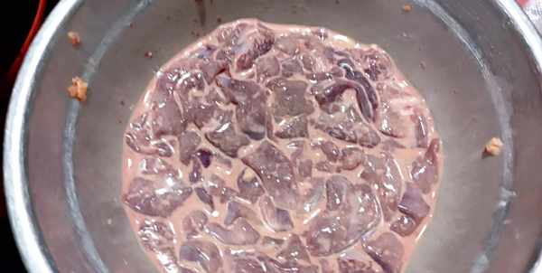 1、新鲜的猪肝,先冲洗一下,再切成均匀的薄片,然后用清水多抓洗几遍,洗干净里面的血水,沥干水分。