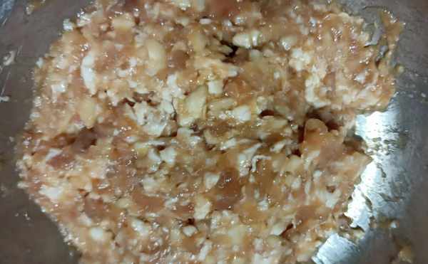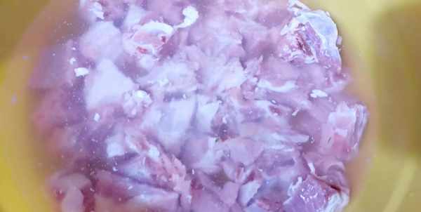 2、300克新鲜后腿肉,清洗干净,切成大块,放入绞肉机,绞成颗粒状的肉馅。