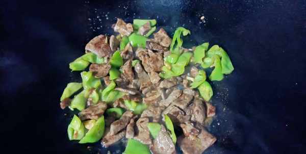 4、锅中倒油,放入姜丝和蒜片爆香,倒入猪肝,大火翻炒,炒制30秒后,猪肝明显变色,再加入青椒,放入少许的酱油,炒制断生就可以出锅了。