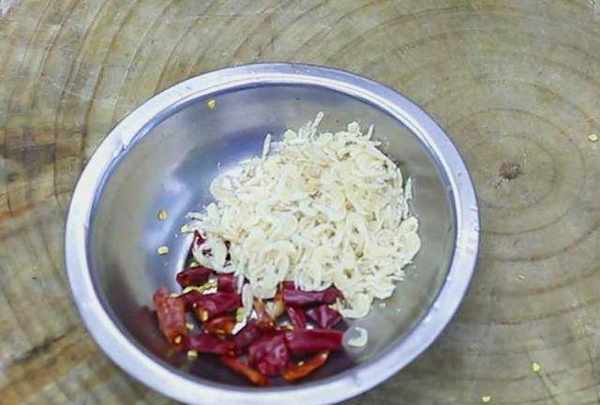 1、准备一把新鲜的空心菜,去除下面的硬根后切成段,然后用清水淘洗干净,注意不要残留杂质和泥沙,洗干净以后捞出来沥水备用。几个小米椒切成圈,大蒜拍扁切成末,另准备一小把虾皮备用。