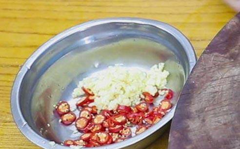 1、准备一小把大蒜,拍扁切成蒜末,几个干辣椒切成段,再放入一小撮虾皮备用。把茼蒿用清水冲洗干净,然后捞出来沥干水分,修剪一下,切去硬杆和上面不整齐的菜叶,这样成菜更加的美观。