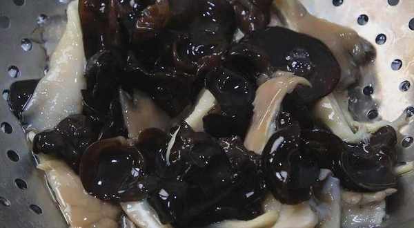 2、然后把食材焯一下水,锅内加入适量的清水,加入少许食盐,给食材入底味。倒入平菇,先焯水30秒,再倒入木耳继续焯水10秒钟后倒出。用清水冲洗冷却备用。