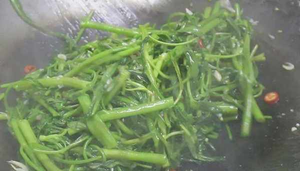 2、锅内烧油,把油充分烧热,放入空心菜的同时加入半勺淡盐水,转大火快速翻炒出锅气,入底味的同时,补充一部分水分,防止炒制时因为水分流失产生的发黄、发黑、以及营流失的现象。