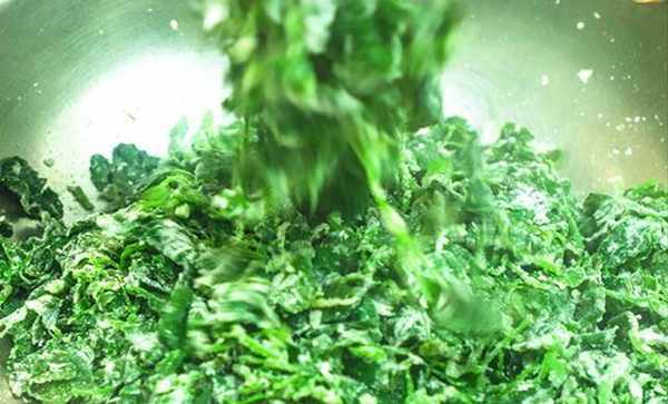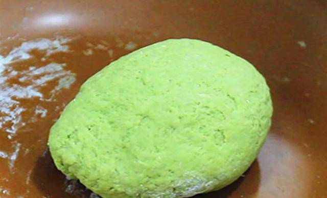 1.艾草焯水后放料理机中打成汁。盆中放入适量的面粉,用艾草汁和面,搅成面絮后揉成团,密封发酵至原来的两倍大。