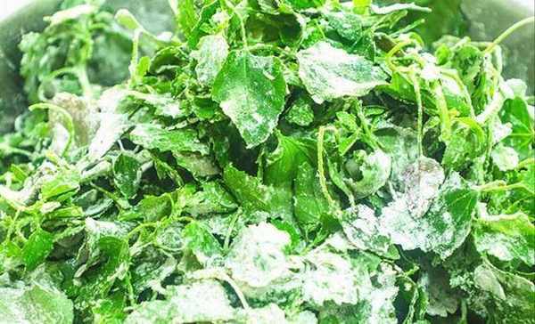 1.首先,我们把灰灰菜清洗干净、沥干水分,然后加入10克植物油拌匀,植物油锁住水分的同时还能使灰灰菜更鲜亮,接着抓入适量的面粉继续拌匀,让灰灰菜都裹上一层面粉,不需要太多、薄薄的一层就行了,面粉太多的话容易粘一块。