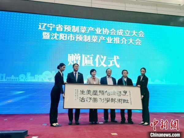 国家级非物质文化遗产传承人、中国饭店协会荣誉会长刘敬贤为辽宁省预制菜产业协会赠送牌匾。 赵桂华 摄