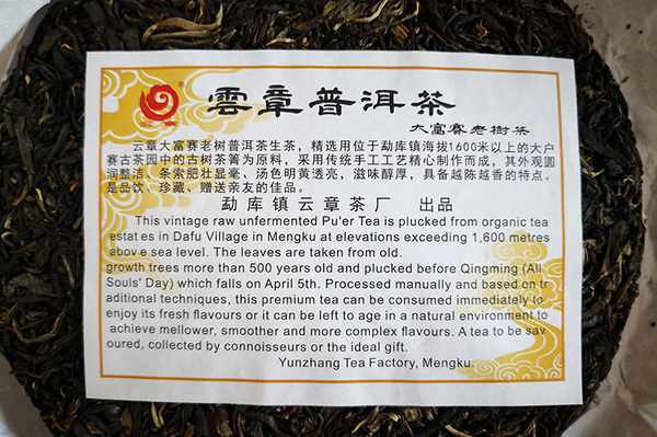 外观:单层棉纸包装,金色的祥云图案呼应着云章的文字和LOGO,简约大方;背面是茶企和茶的相关信息;有内票、内飞,内票为大富赛生茶的中英文简介。