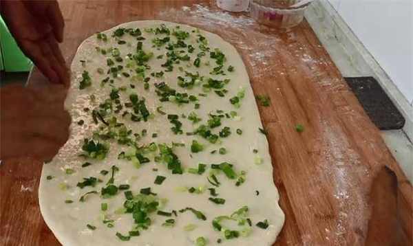 2.现在面团发酵好了。碗中加入一茶匙小苏打,加入少量热水化开,倒入碗中与面团揉在一起,再次揉匀,将面团分成两等份,揉匀,然后用擀面杖擀成均匀的厚度,在上面刷一层油,撒少量盐,再撒上葱花。