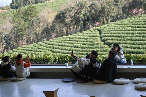 游客在浙江省安吉县黄杜村万亩茶园边的咖啡馆留影(2月21日摄)。新华社记者 黄宗治 摄