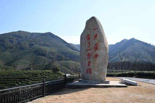 刻有“一片叶子富了一方百姓”字样的石碑立在浙江省安吉县黄杜村万亩茶园边(2月21日摄)。新华社记者 黄宗治 摄