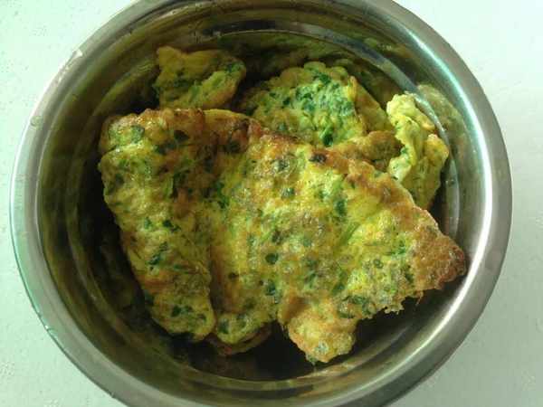 4.锅洗净放入食用油,把上述处理好的鸡蛋豌豆苗倒入锅中小火煎至2面金黄,即可出锅