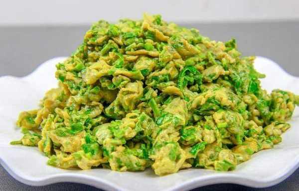材料:豌豆苗一把,鸡蛋3-5个,食盐少许
