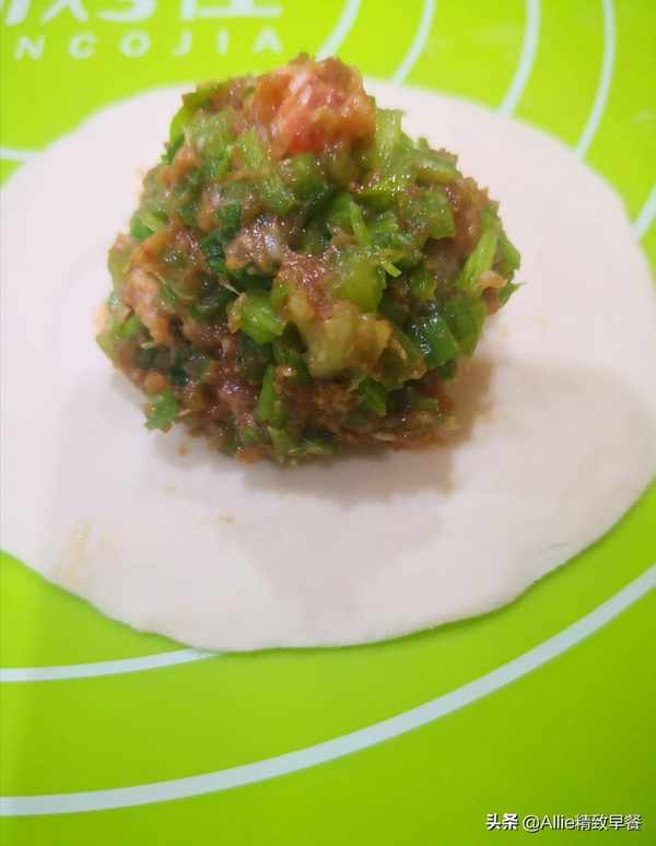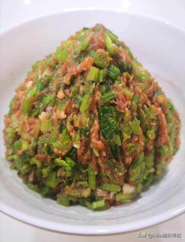 将猪肉放入绞肉机绞碎,加入适量的盐、老抽、生抽、葱花和姜末,先拌匀,然后加水分几次,顺时针方向搅拌肉直到它变硬,这样做的肉。馅料柔软多汁,不粘手。