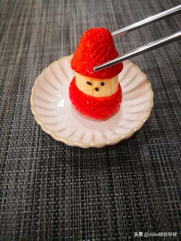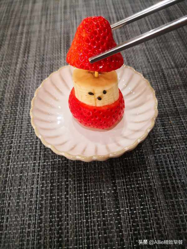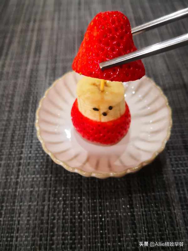 草莓切半,香蕉切片,准备适量炒黑芝麻。草莓上面放一根香蕉,香蕉边上放三粒黑芝麻用手轻压,中间插根牙签固定,牙签太长我剪掉一点。