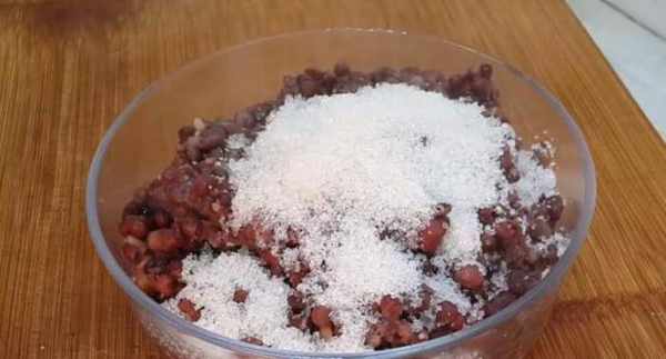 2.将磨碎的红豆放入烤箱,加水没过红豆,盖上盖子大火煮,小火煮20分钟,然后关火,取出红豆放入。在碗中加入30克白糖拌匀,静置2小时即成红蜜。