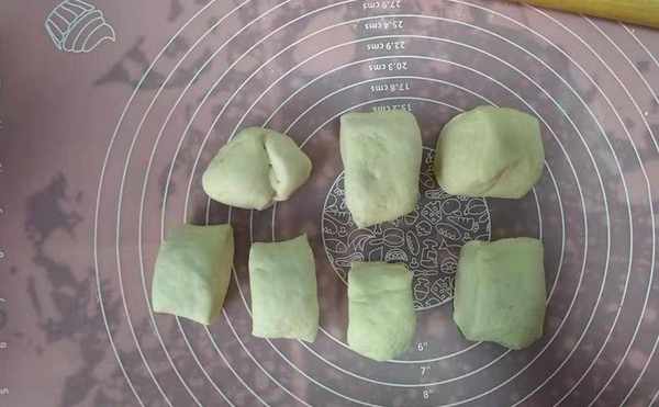 5、将面团从uvre中取出,案板上撒上干面粉,用手揉搓,排除多余的气体。将面团背面揉好,切成小块。