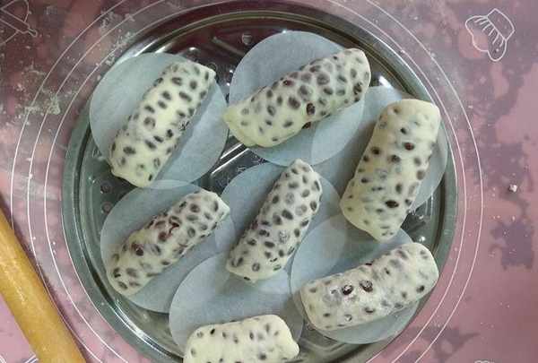 3、除了上面的包法外,还可以擀成牛舌状,上面放一个红豆卷,再卷起来。这样,红豆就在里面,外面看不见了。它更像一个馒头。