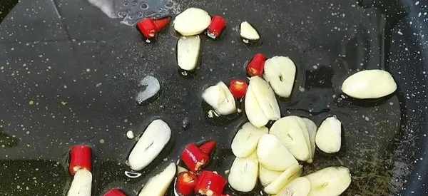 2锅里放油烧热,放入蒜片和小米蒸香。