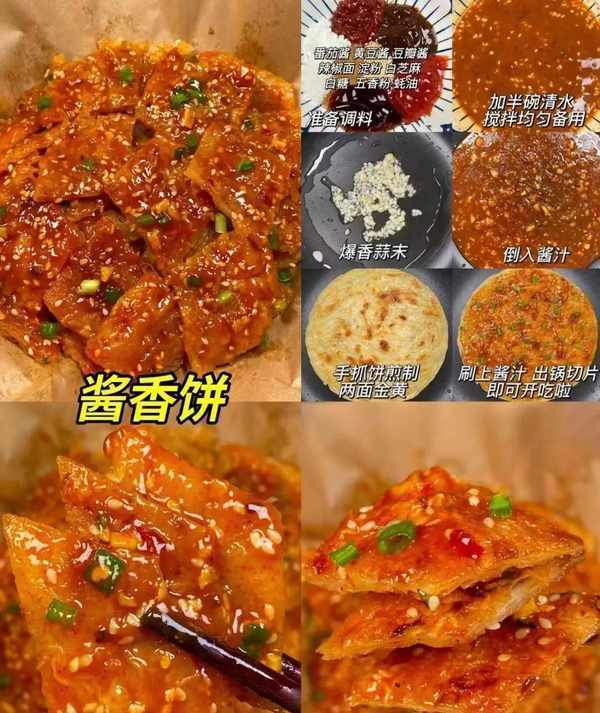 ③将饼煎至两面金黄,刷上调好的酱汁,撒上葱花,出锅切块食用