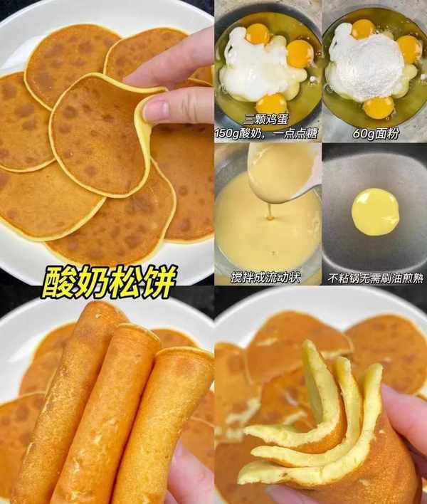 做法:鸡蛋三个,酸奶150克,白糖少许(可有可无),面粉60克,搅拌成液态,不用勺子洗净油,用勺子抓一点粘稠的糊状物,倒入锅中,两面煎熟双方。