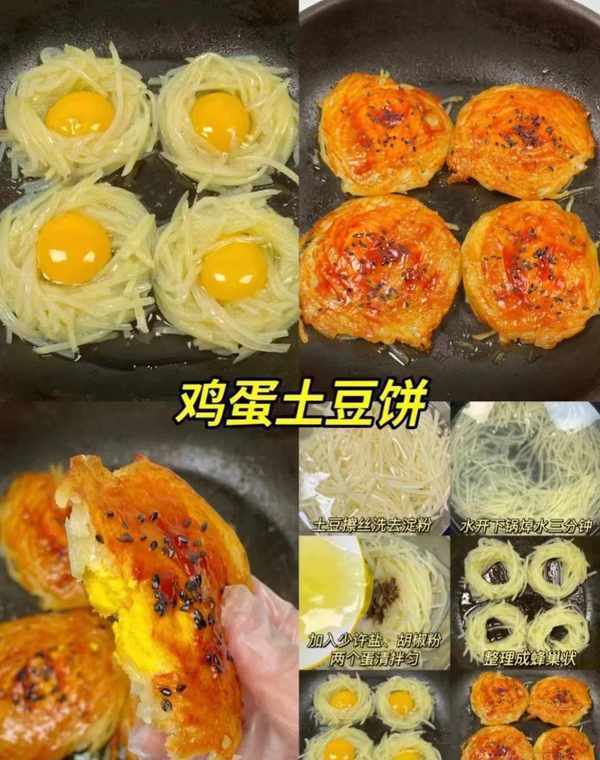 做法:土豆泥搓洗掉星星,水烧开三分钟,加少许盐,胡椒粉,两个蛋清拌匀,锅里油烧热,把土豆泥摆成蜂窝状,一个鸡蛋蛋黄在中间,小火慢炸,刷上番茄酱,撒上黑芝麻