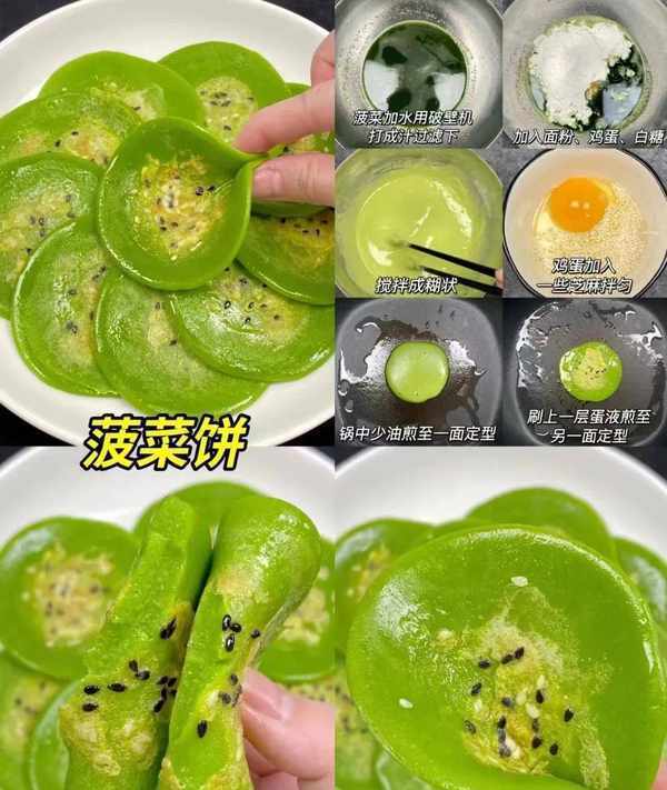 做法:将蔬菜煮沸,加水,用破风机打汁,过滤,加入面粉,鸡蛋,糖,搅拌成糊状,鸡蛋加少许芝麻拌匀,下油少的平底锅煎至一一边放,一边刷一层鸡蛋芝麻液,另一面煎成