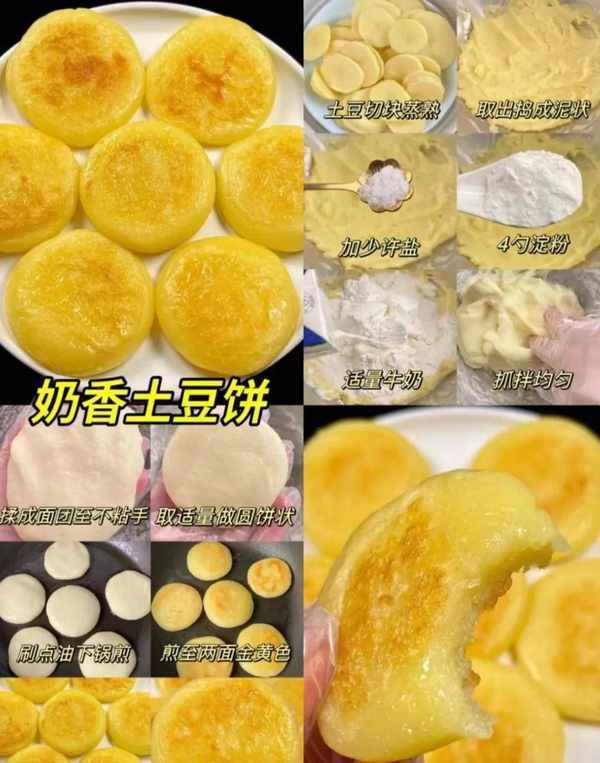 做法:土豆切块蒸熟,取出拌匀,加入少许盐、4勺淀粉和适量牛奶(可用水代替牛奶)。土豆泥,拌匀。