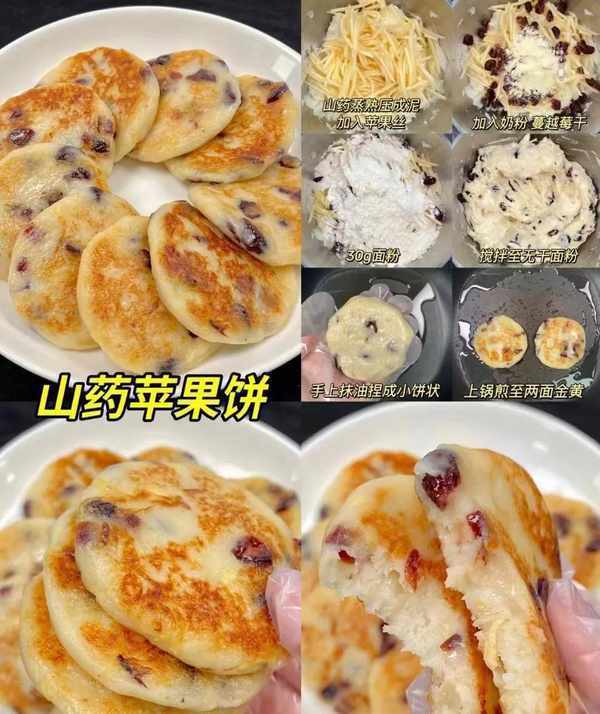 做法:山药蒸熟压成泥,加入苹果碎、奶粉、蔓越莓干、30g面粉,搅拌至无干粉,手上抹油,取一块面团揉成小饼,放入锅中煎至两面金黄