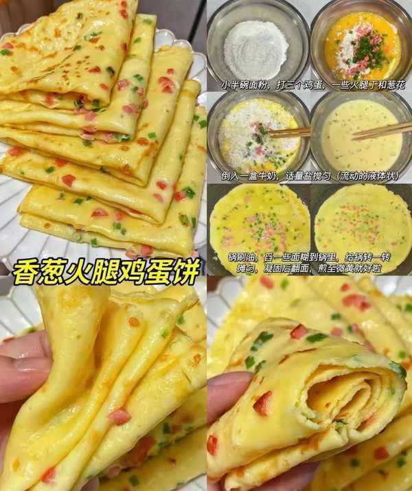 做法:加半碗面粉,打三个鸡蛋在里面,一片火腿和葱花,倒入一盒牛奶(我不喜欢用牛奶代替水),加盐拌匀(是液体面皮厚的话可以加少许水),锅刷油,倒入少许面糊,把面糊摊匀,变硬后翻面煎至两面金黄微黄