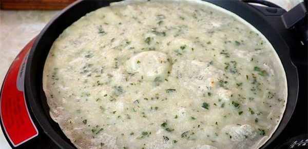 5、电煎锅刷一层油预热,倒入一勺面糊倒入电煎锅中,然后将面糊摇匀,将面糊均匀地铺在电煎锅上,这样饼就顺滑均匀,盖上锅盖煮透,大概一分钟左右就可以直接出锅了,不用翻。