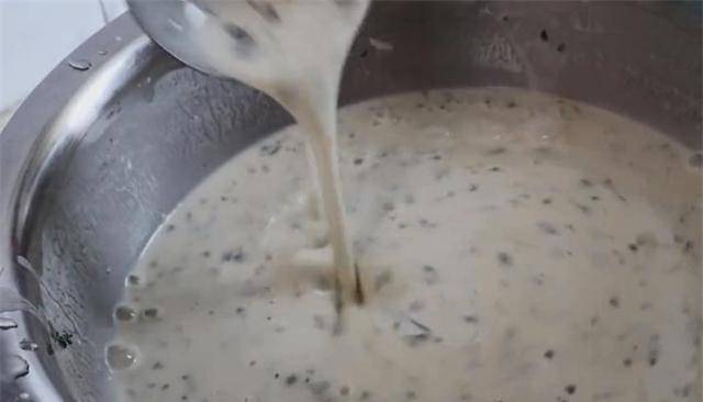 3、碗中加入适量面粉。我加了一份猫粮,大约6个人。将切碎的花椒叶倒入盆中,然后根据个人口味加入适量的盐,再加入清水搅拌均匀,面糊就可以搅拌成这样的稀稠度,然后静置20分钟左右。