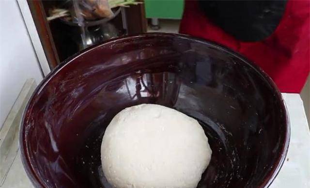 4、现在面团发酵好了,这个碗里有一点点温水,加入一小勺小苏打和面团搅拌均匀。加入小苏打的作用是让葱油饼更加松软可口。