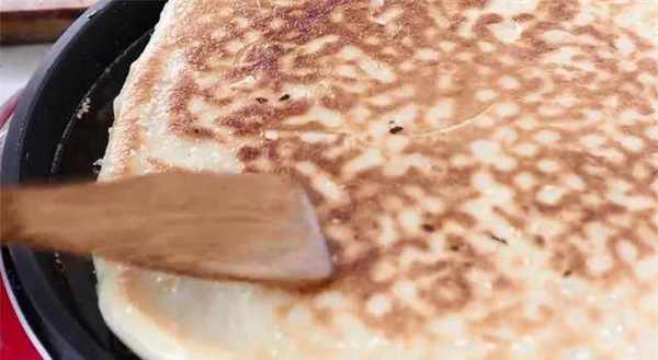 8、在电煎锅上倒入适量的油,用刷子刷匀。油热后,将擀好的饼胚放在上面烤。每隔两分钟翻转蛋糕并烘烤一次。烤的时候盖上盖子,这样可以保证蛋糕里面也熟透。最后两面金黄就可以出锅了。我烤了大约7-8分钟。