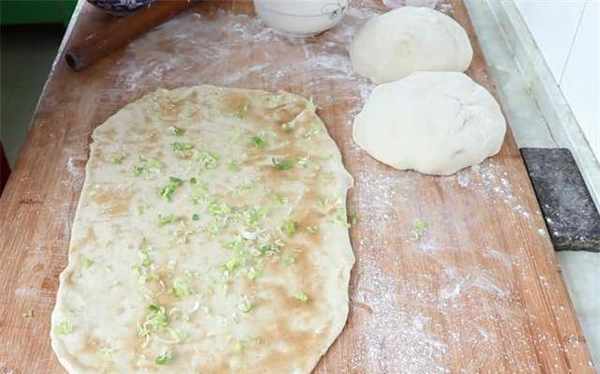 5.案板上撒些干面粉,将面团揉成长条,然后搓成三个大小一样的小面团,然后把小面团分开排列,用擀面杖擀成薄而均匀的面团蛋糕,在上面刷上油酥皮,然后均匀地撒上葱花。