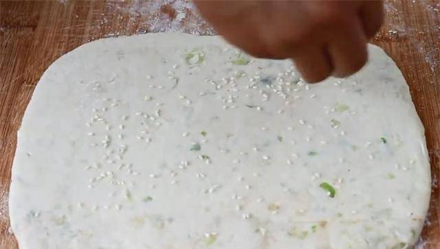 7、完成后,用擀面杖擀成薄而均匀的饼胚,刷上一些水,撒上白芝麻,用手轻轻按压。
